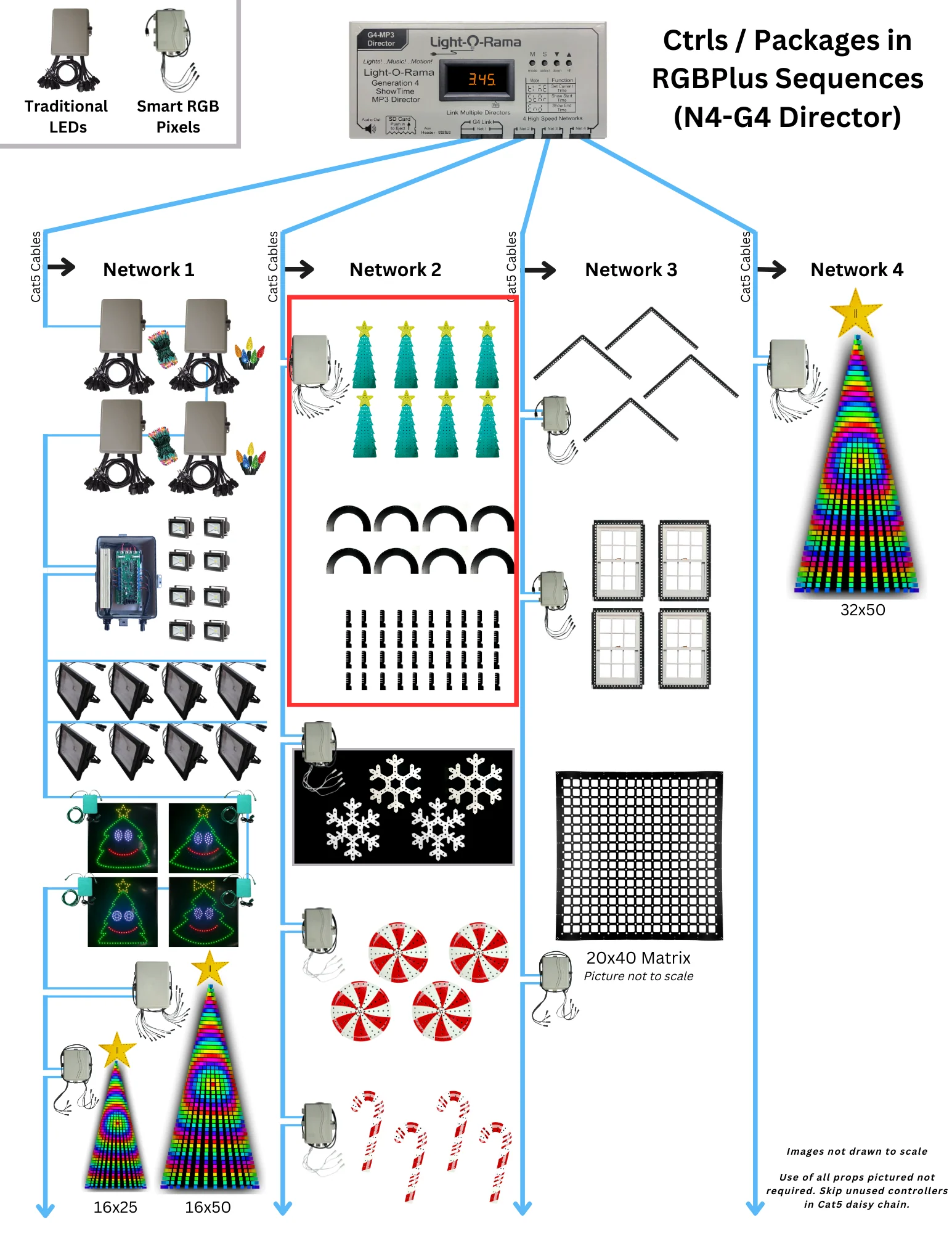 For non-modified use with RGBPlus sequences, the controller in this package must be connected to Network Aux A/Network 2. Each network in your show requires a USB485-HS Adapter (computer show) or an available port of a Showtime Director.